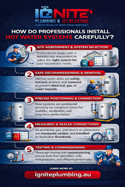 To get your hot water system installed by a professional, consider Ignite Plumbing and Jet Blasting, your friendly plumbing service provider today. Call 0426 663 544 now.